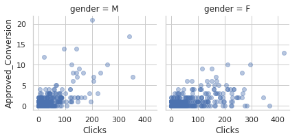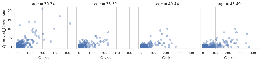 g.map(plt.scatter, "Clicks", "Approved_Conversion", alpha=.4)
