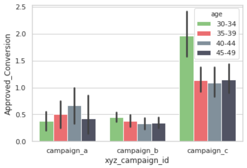 It's clear from both the above graphs that compaign_c has much more purchases (i.e. most people bought products in campaign_c). Let's see the distribution by age and gender.
