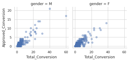 g.map(plt.scatter, "Total_Conversion", "Approved_Conversion", alpha=.4)