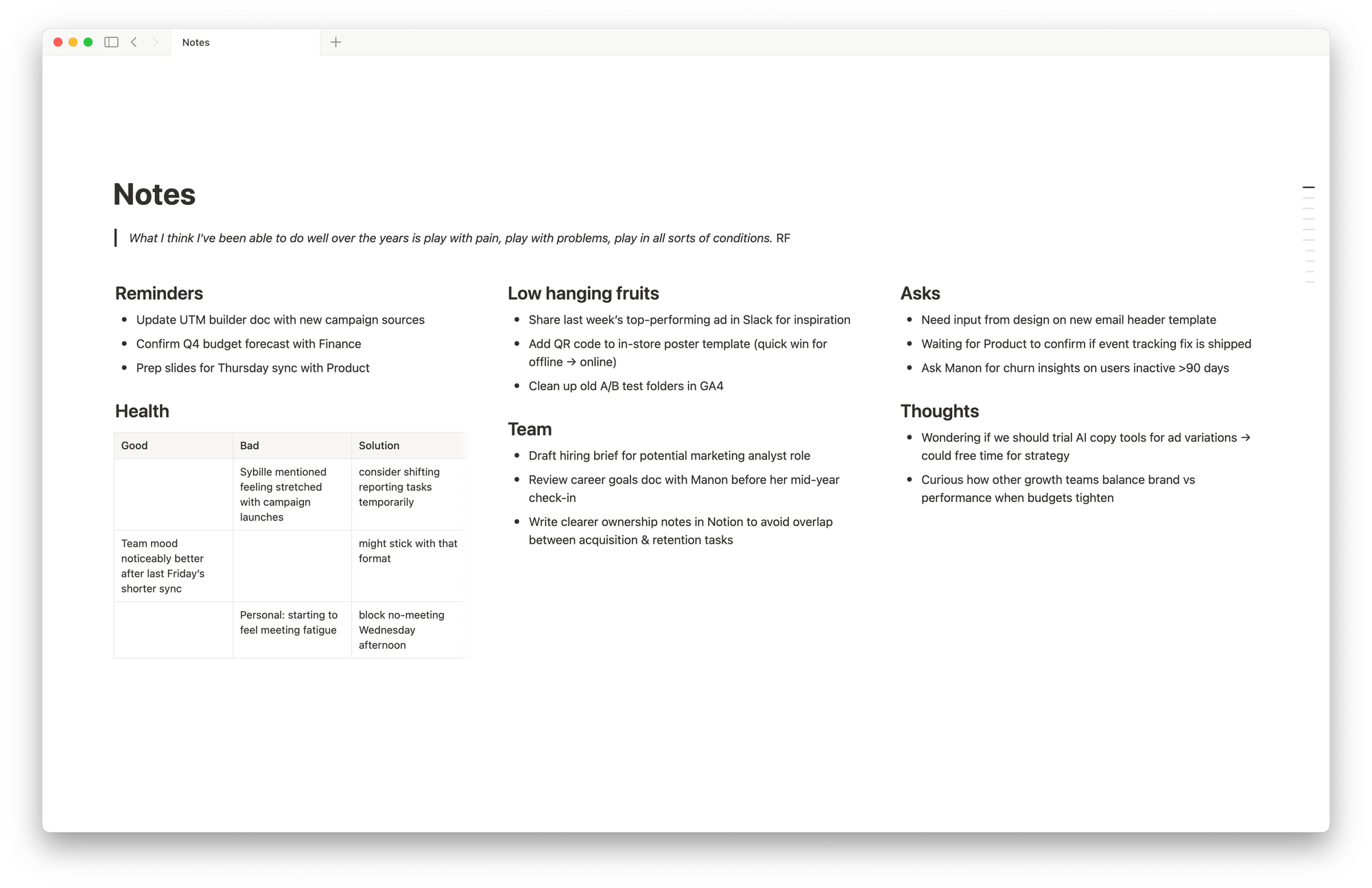 - Health: team feedback or personal observations I log, with solutions if something’s off.